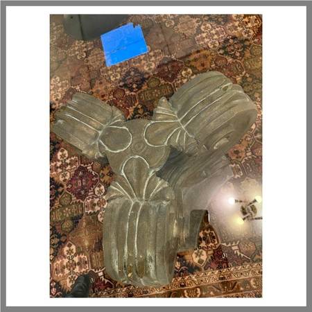 Design Plus Gallery presents a Vintage Pedestal Dining Table. Cast plaster, molded and finished to look like an ancient pediment, elevates a 3/4 inch round of glass. The pair create a lovely center table or intimate dining table. Light surface wear; nicks; condition is fair for age and use.