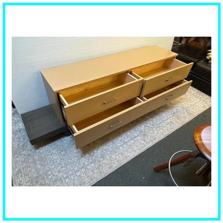 Design Plus Gallery presents a Custom Contemporary Low Media Credenza. This lowslung storage and display unit combines clean modern styling with superb functionality. It features four dovetailed drawers with ample storage space, finished in a matte manila finish and equipped with brushed stainless steel pulls. The storage is elevated on a contrasting darkfinished wood platform that extends on both ends, providing additional display space. Light visible surface wear; and nicks; condition is consistent with age and use. Made in the USA