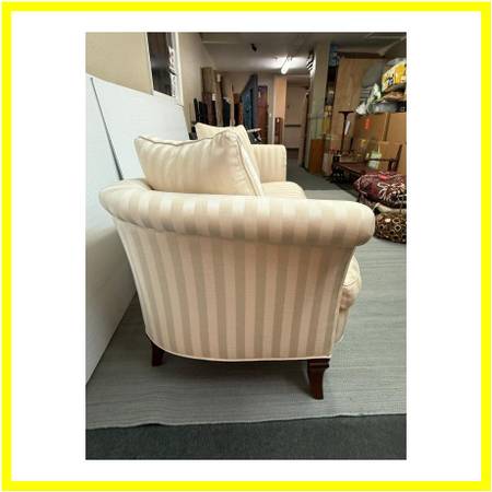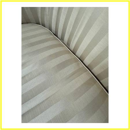 Design Plus Gallery presents a Custom Salon Sofa. Oh so elegant, with curving silhouette, welted bench seat cushion, flared arms and tapered mahogany leg, this sofa invites a long repose. Wrapped in tonal satin stripe upholstery for a subtle glow. Visible surface wear on one side of seat cushion cover; condition is fair for age and use.