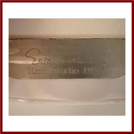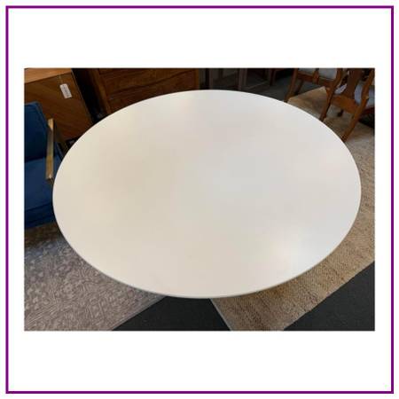 Design Plus Gallery presents a Round Saarenin Tulip Table from Knoll Studios. Inspired by a drop of highviscosity liquid and the practical need for legroom, Eero Saarinens iconic dining table design continues to be a favorite. The white laminate round top provides ample space for a small gathering, while the gracefully shaped castaluminum base adds a touch of elegance. This is the authentic Pedestal Table by Knoll, stamped with the KnollStudio logo and designers signature. In good condition, visible and minimal wear from usage.