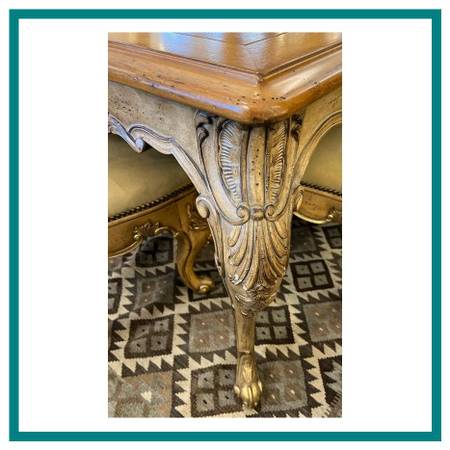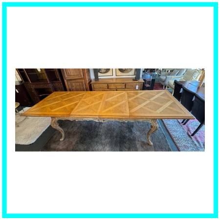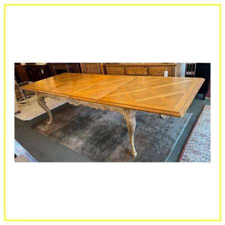 Design Plus Gallery presents a Louis XV Extension Dining Table by Ferguson Copeland. Crafted from solid woods and fine veneers, it features an intricately carved apron and clawed feet. The elegant table surface has a trellis pattern crafted of Oak and Maple veneers. The table base is #350 Weather Mark finish. Includes 2 22 inch leaves. In fair vintage condition, visible top surface wear; consistent with age and use. Made in North Carolina, USA.