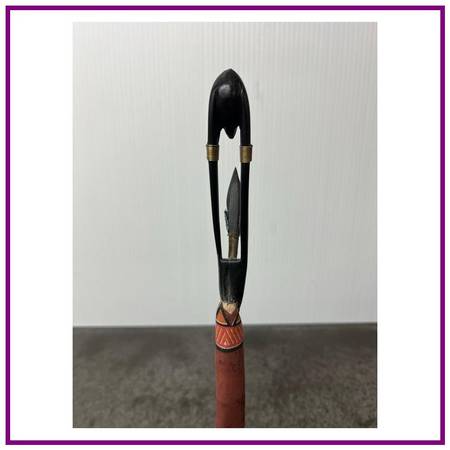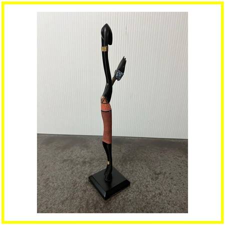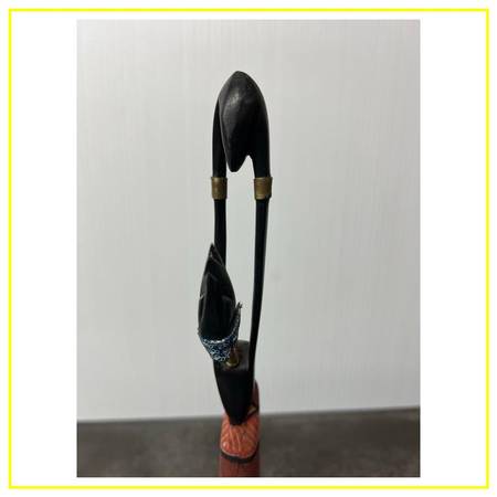 Design Plus Gallery presents a Vintage African Beaded Woman Figurine. This handpainted fabric and wood carved figurine has a traditional black finish and is adorned with colorful details and patterned skirt. The metal bracelets on the wrist and ankles accent that the sculpture is inspired by African culture and tribal art. It will add an ethnic sense to a room that surly wont dissapoint. Item is in good condition, visible and minimal surface wear that is consistent with use.