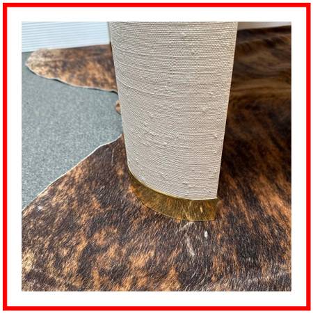 Design Plus Gallery presents the Willie Coffee Table from Highland House. The coffee table has rounded edges that soften its appearance. The table is made from solid oak wood that is then wrapped in an ivory tone of raffia veneer. All four legs have brass cap ends. The table will be an elegant centerpiece for your living space. This table is in good showroom condition with minimal wear.
