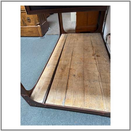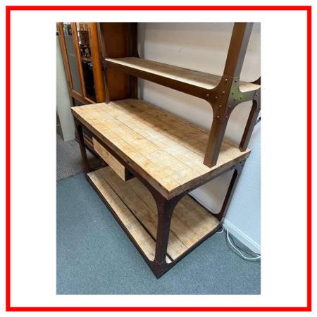 Design Plus Gallery presents a 2pc Industrial Hutch. Crafted from durable painted iron, with bolts intact, the work surface and shelving are thick slabs of oak. Sturdy enough for outdoors, it has only been used indoors to date. Deep shallow drawer keeps accoutrements handy. Rustic appearance is intentional; condition is good for age and use.