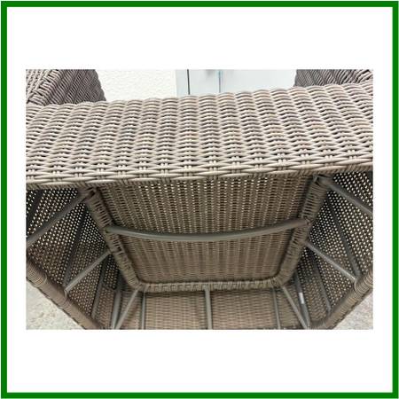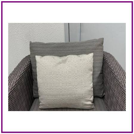 Design Plus Gallery presents the Zeya Collection Lounge Chair from JANUS et Cie. Their Zeya collection takes inspiration from vintage European design and updates it with an American spirit and generous proportions. The rattan is woven with gracefully rounded arms to soften angled silhouettes in its seating. Zeya is handwoven from their proprietary JANUSfiber in their Acacia finish. Two loose cushions with matching pattern for seat and back, with one solid throw pillow. There is a brand plate on the chair. Is in good condition for its usage.