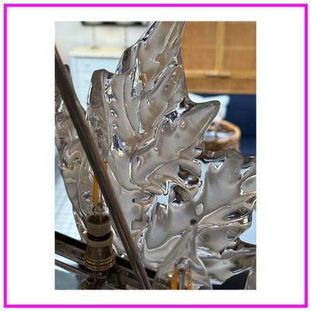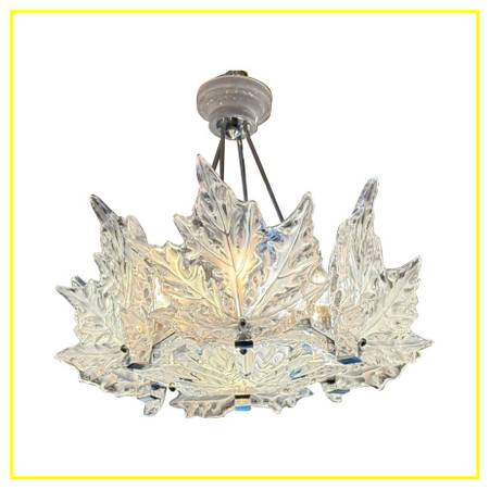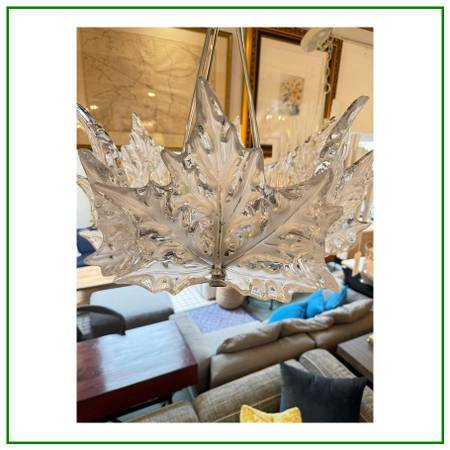 Design Plus Gallery presents the Champslyses Chandelier by Lalique. From the sconce to the monumental chandelier, Lalique was inspired by the Champslyses bowl designed in 1951 by Marc Lalique to create this lighting collection. The finely veined leaves are reminiscent of the sumptuous alleys of planetrees that run alongside the most beautiful Avenue of the World. Through a mysterious alchemy, the light shining through the purity of the crystal creates ever changing reflections, making every piece unique. The chandelier is in good showroom like condition with minimal visible wear. Made in France.