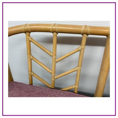 Design Plus Gallery presents a Vintage Loveseat from McGuire Furniture. Timeless elegance and craftsmanship of the iconic McGuire furniture. Its barrelback silhouette curves gracefully, creating an inviting, sculptural form that wraps around its occupants in comfort and style. Crafted from bent bamboo rods, the frame showcases McGuires signature use of natural materials, each rod expertly bound with handwrapped rawhide laces at the joints, enhancing both strength and artisanal appeal. At the base, unique black suspension straps offer support for two loose seat cushions and two loose back pillows, promising superior comfort with resilient undercushion give. The upholstery is rendered in a soft Duty Rose colora lovely, muted rosy hue that pairs beautifully with the light tone of the bamboo frame. Combined with its soft, rounded lines and air of organic sophistication, this loveseat is equally at home in classic, coastal, or bohemianinspired spaces. Distinctive and enduringly stylish, its a collectors piece for those who appreciate the harmony of natural materials, innovative design, and exceptional craftsmanship. McGuire brass table plate is underneath. This style is a discontinued with their brand. In good condition, visible and minimal wear from usage.