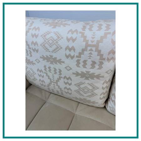 Design Plus Gallery presents the Lenny Sofa from Ligne Roset. A kiln dried wood frame supports the low + lounge styled frame. Back cushions are filled with a down insert. Blind tufted seat cushions are made of a firm foam. Tubular metal legs support the frame. The sofa is mostly upholstered in a Alcantara beige, microsuede and the back cushions are in an Aztec print in tones of beige with white. The upholstery and cushions are slip cover and removable for professional cleaning. Includes pair of lumbar pillows shown. Visible and minor wear consistent with use; sofa is in good condition.
