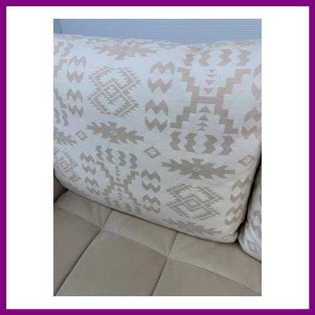 Design Plus Gallery presents the Lenny Sofa from Ligne Roset. A kiln dried wood frame supports the low + lounge styled frame. Back cushions are filled with a down insert. Blind tufted seat cushions are made of a firm foam. Tubular metal legs support the frame. The sofa is mostly upholstered in a Alcantara beige, microsuede and the back cushions are in an Aztec print in tones of beige with white. The upholstery and cushions are slip cover and removable for professional cleaning. Includes pair of lumbar pillows shown. Visible and minor wear consistent with use; sofa is in good condition.