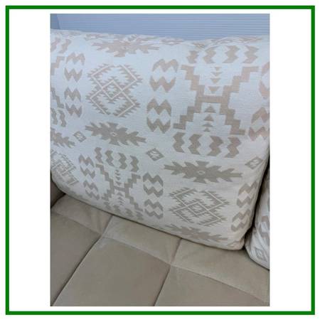 Design Plus Gallery presents the Lenny Sofa from Ligne Roset. A kiln dried wood frame supports the low + lounge styled frame. Back cushions are filled with a down insert. Blind tufted seat cushions are made of a firm foam. Tubular metal legs support the frame. The sofa is mostly upholstered in a Alcantara beige, microsuede and the back cushions are in an Aztec print in tones of beige with white. The upholstery and cushions are slip cover and removable for professional cleaning. Includes pair of lumbar pillows shown. Visible and minor wear consistent with use; sofa is in good condition.