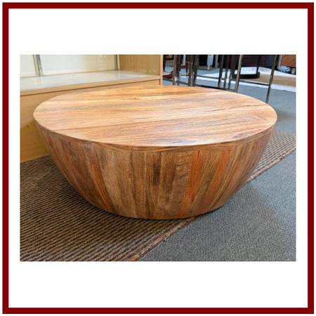 Design Plus Gallery presents the Jensen Coffee Table from McGee Co. The Jensen coffee table has a gentle curves with surrounding wooden slats to create a sturdy table. It is finished with a sensational tobacco wash to bring a touch of nature into your home. It is made from natural materials so each one is unique to others. Visible surface wear is present to the table top, as shown, but overall it is in good condition. Made in India.