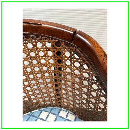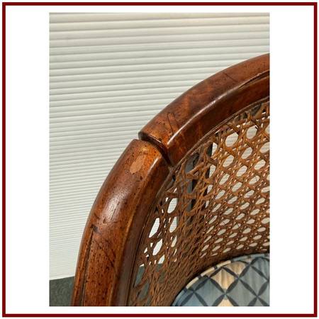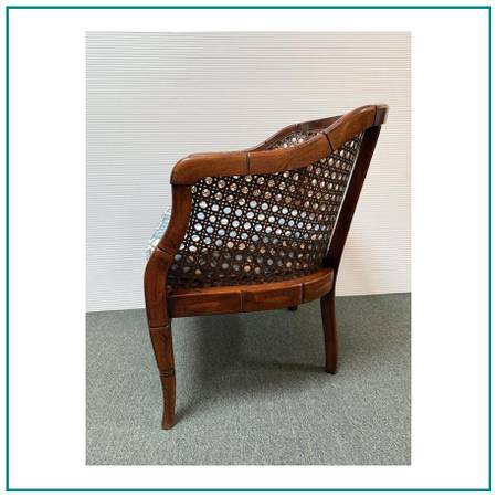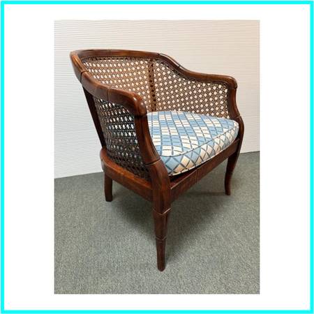 Design Plus Gallery presents a Mid 20th Century Barrel Chair. The elegant carving silhouette is crafted from bamboo, the lovely form is crafted by handwoven caning. The welted loose seat cushion, in blue and white pattern, insures comfort and style. Light surface wear; condition is good for age and use.