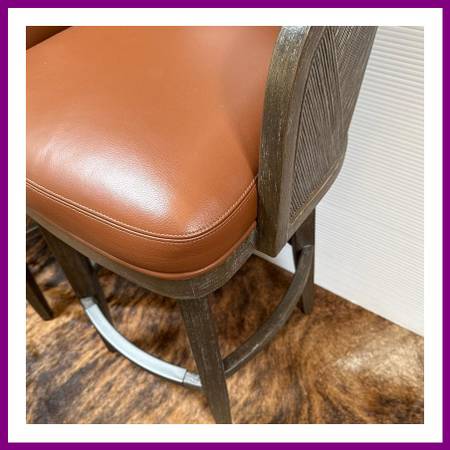 Design Plus Gallery presents a Set of Three Bar Stools from Palecek. The set are exquisite pieces of furniture for any home. Boasting a handdistressed hardwood frame and legs with a pewter finish footrest, this premium quality stool features an eyecatching mocha finish and is upholstered in a cognac leather. With its 360degree swivel mechanism, the stools offer an elegant yet comfortable seat for you to experience luxury that comes with their sophisticated design. They are all in good condition for their usage.