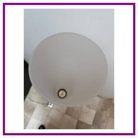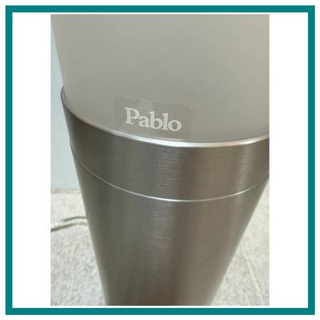 Design Plus Gallery the Elise Floor Lamp from Pablo Designs. This floor lamp is in the brands frosted white with silver color way. The shining aluminum base complements the bright light that is softened with the towering frosted acrylic diffuser to provide balanced illumination. With a full range of dimming control, change the mood in seconds for an appealing feature. It is in good condition for its usage. Made in the USA.