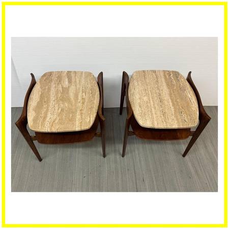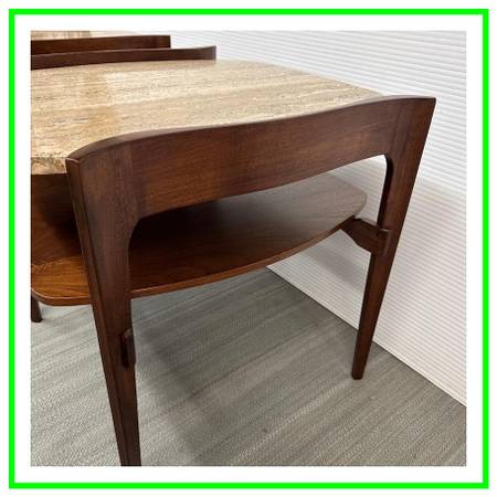Design Plus Gallery represents walnut + travertine end tables by Bertha Schaefer.
