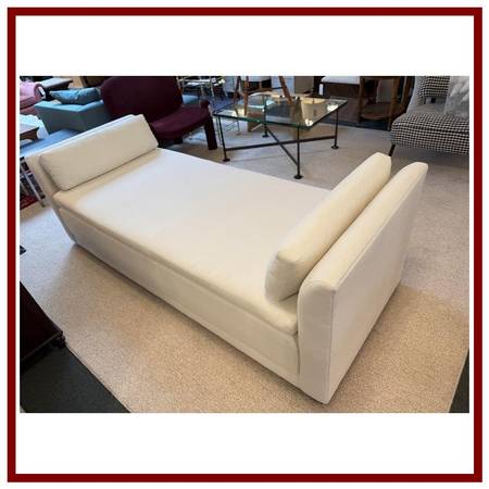 Design Plus Gallery presents the Luna Daybed from Pottery Barn. The daybed works great as a bench seating or chaise lounge in an extra room or office but when company, or friends sleepover, this twin size bed will slide over to create a queen size platform sleep situation. It is in the brand perennial fabric in a neural white with two matching lumbar pillows. Light surface wear and overall its condition is good. Made in the USA