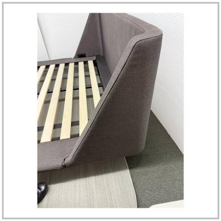 Design Plus Gallery presents a Queen Size Nook Bed Frame from Blu Dot. The curved, upholstered in their Gray fabric headboard flows into a slim, padded frame. This is a nice compact bed frame that looks good at any angle. Black powdercoated steel legs seem to disappear beneath the bed frame. The fabric is a discontinued finish. Is in good condition, visible and minimal wear from usage.