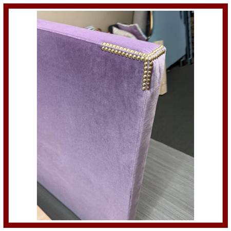 Design Plus Gallery presents a Queen Size Connery Bed Frame from Jonathan Adler. Upholstered in a there Venice Amethyst velvet, this bed frame offers a rich, tactile experience that adds a regal aura to any bedroom. The design is complemented by meticulously placed gold finish nailheads, thoughtfully arranged to echo the classic campaign corners, contributing an additional layer of ornate detail without overwhelming the frames clean lines. Resting on sturdy, chunky solid brass legs, the bed frame provides a robust foundation that promises durability and stability. Despite its usage, the bed frame remains in good condition with only minimal wear. Made in USA.