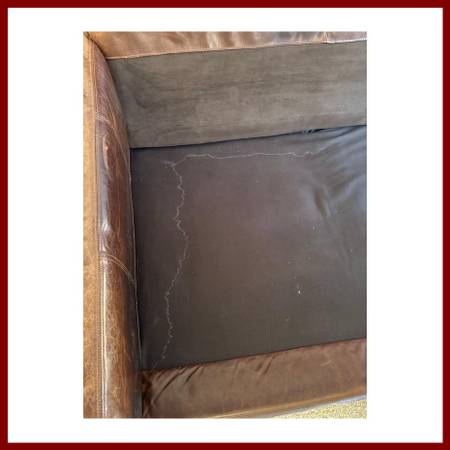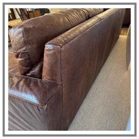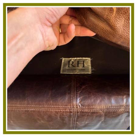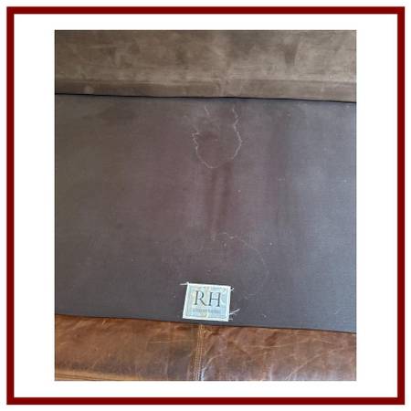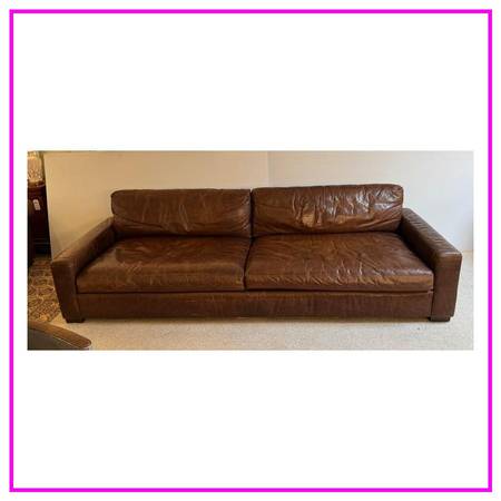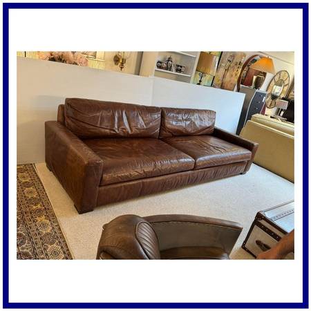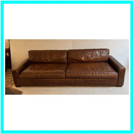 Design Plus Gallery presents the Maxwell Sofa by Restoration Hardware. Sublime minimalism meets supreme comfort. Clean lines and a streamlined silhouette define its architectural attitude, while sumptuously padded cushions play plush counterpoint. Featured in Antiqued Whisky hued leather, the 10 foot long sofa is built in the luxe depth and has loose regularfill seat and back cushions. Block wood feet. Light surface wear; spill evident under cushion; condition is consistent with age and use.