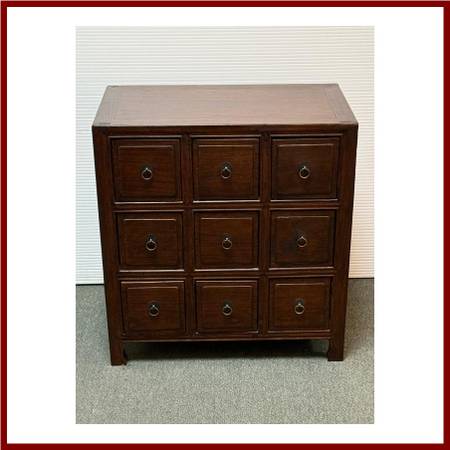 Design Plus Gallery presents a Vintage Chinese Apothecary Chest. Classic ninedrawer storage, the cabinet is handcrafted with dove tail joinery. Small panelfront drawers each have a brass pull. Light surface wear; condition is consistent with age and use.