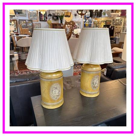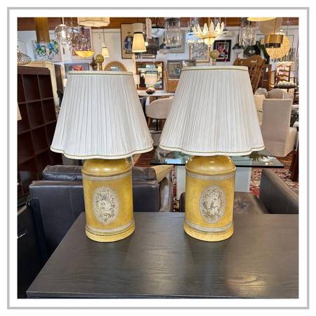 Design Plus Gallery presents a Pair of Chinoiserie Table Lamps from the 1970s. This duo seem to glow as the painted metal picks up on their light, casting a fantastically rich color off of them. They both have identical ovals on that should be front facing with two different oriental scenes displayed. They offer scalloped edged pleated shades and matching finials. They are in good condition for their usage.