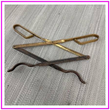 Design Plus Gallery presents a Set of Four Vintage Fireplace Tools. Traditional styling in solid brass, with shovel, poker, log lifter and tong. Beautiful and functional tools to warm you and yours by the hearth. Visible wear and condition that is consistent with age and use.