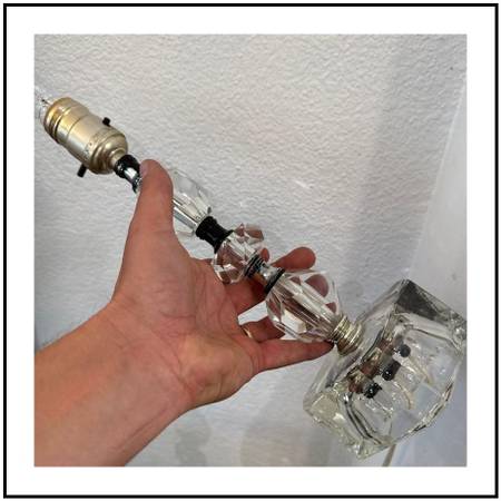 Design Plus Gallery presents a Pair of Boudoir Table Lamps in the Hollywood Regency Style. The lamps have thick base with a candlestick like body made from cut glass. They are heavily faceted and set between antiqued brass for a vintage, near historical feel. They are in good condition for their age + use.