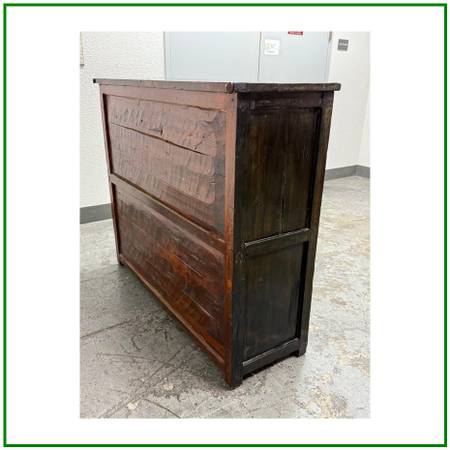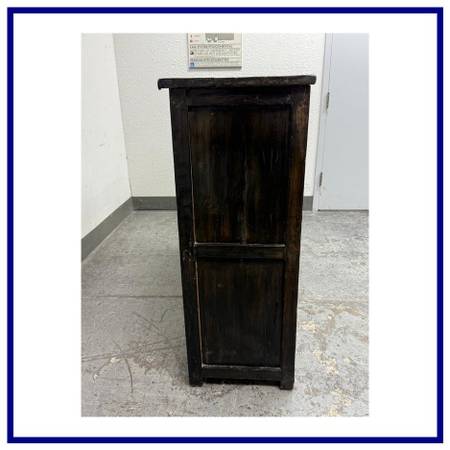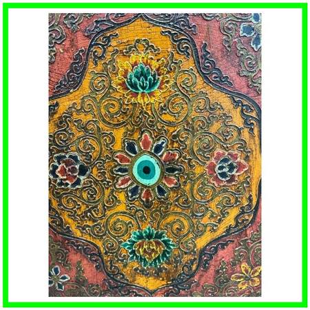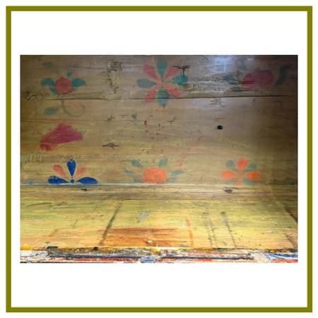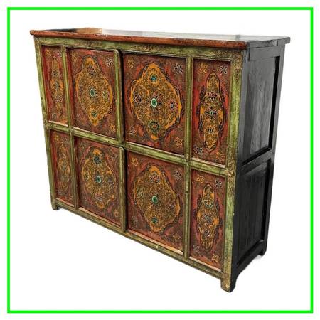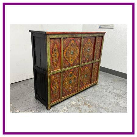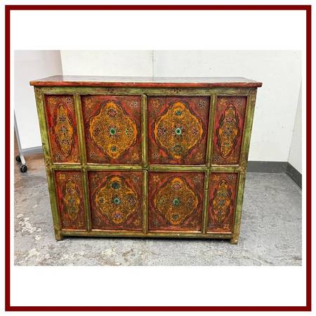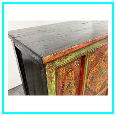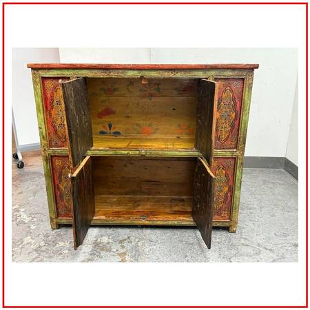 Design Plus Gallery presents a Handpainted Tibetan Cabinet. Tibetan tradition and finished with a timeworn patina, this solidwood cabinet brings color, craft, and character to any room. The body carries a rich, dark wood finish, while the front frame is washed in a distressed green that sets off the handpainted panels. In warm shades of orange and red with an artfully distressed finish, the panels feature lotus blossoms and botanical motifs rendered by hand, giving the piece a soulful, collected look. Two doors open to reveal a single fixed shelf for practical storage. Inside, a distressed yellow ground bursts with vibrant painted florals, a hidden detail that delights each time you open it. Designed to look like a cherished antique, this piece blends authentic styling with durable, everyday use.In good condition, minimal wear.