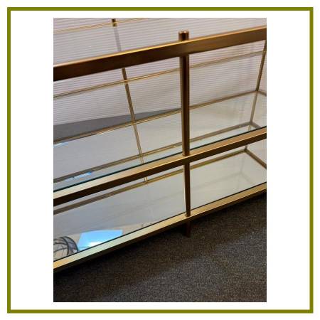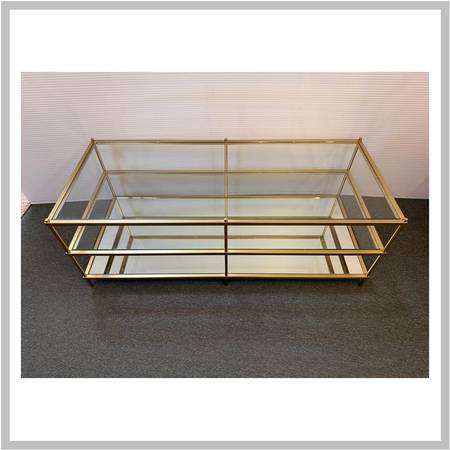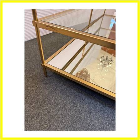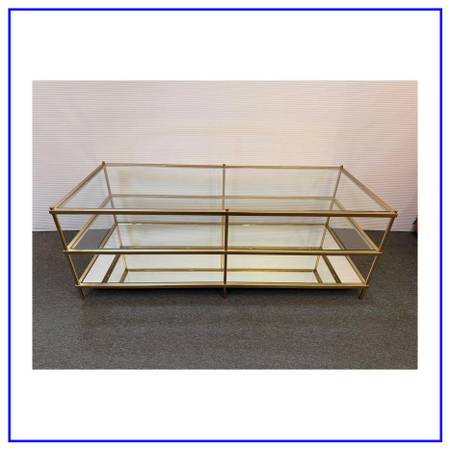 Design Plus Gallery presents a Terrace Coffee Table from West Elm. The Antique Brass finish, glass top, and shelf rest on a mirrored base that is sure to impress. The top and center pieces of glass are clear, while the bottom piece is mirrored, for a superb display of treasures. This item is in good condition, visible and minimal surface wear thats consistent with use.