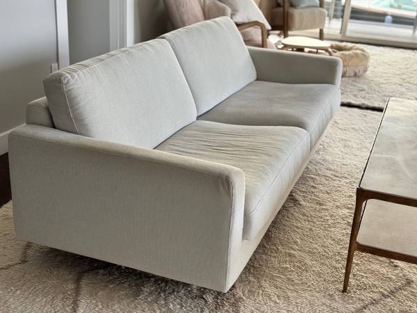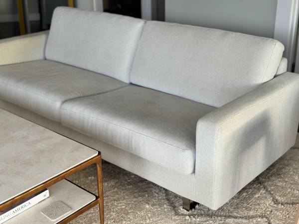 Selling an EQ3 Oskar sofa in the 85” size, upholstered in the Florence Spring fabric. It has a clean, modern silhouette and a sturdy build, with a soft neutral tone that works well in many spaces.