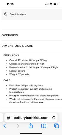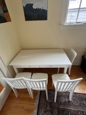 This is the PB Carolina craft table and 4 chairs in the color “simply white.” It has a roll of craft paper on one side and two small drawers in the front. We bought these 10 years ago for $675 before tax. They are in good condition with some small paint marks. All of the items are very sturdy.