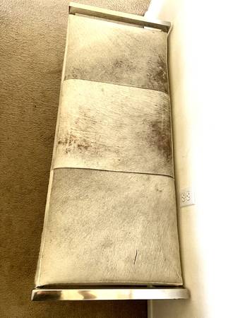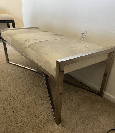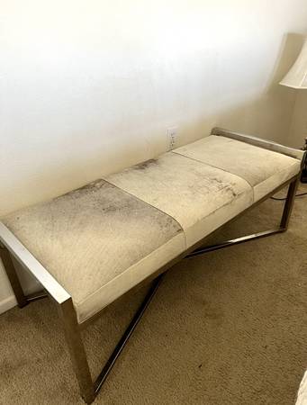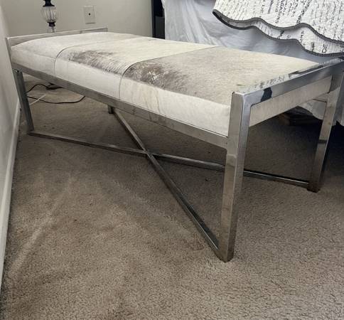 Genuine cowhide bench with chrome frame and legs. Brand new with small cut in cowhide. Please see photo. Approx 20 inches deep and 48 inches wide