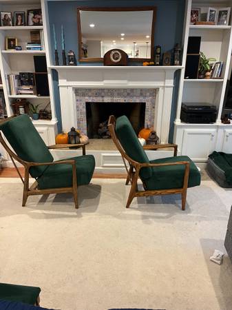 These stunning mid century modern sculpted oak lounge chairs by Jack Van Der Molen are quite comfortable with superior construction. There is a reclining mechanism so the seat can slide forward (+/- 4 inches) to a slight reclining position. These chairs are in great shape with recently upholstered cushions in a green velvet polyester fabric. Some light scuffing/scratching to the wooden frames from age appropriate wear, some wear on the cushions as these chairs are regularly used.