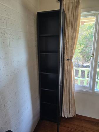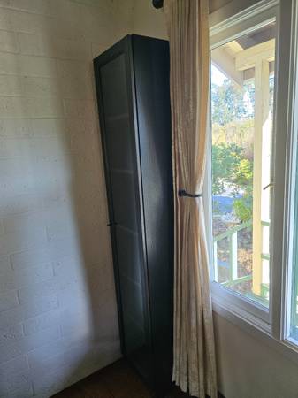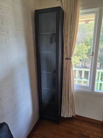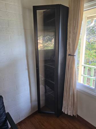 Quality tall cabinet 80 in tall by 17 in w,by 12 d,excellent condition with glass door,good for glasses near a dining room table, excellent condition no issues, not too heavy i can help load, I believe it's from crate and barrel, $100.