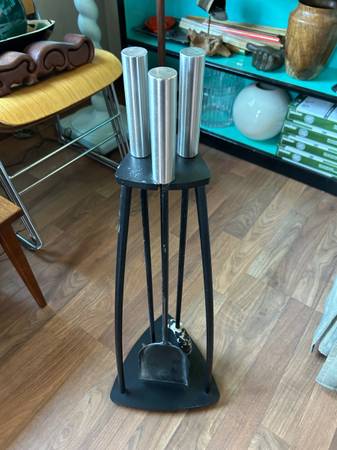 Wrought iron modernist fireplace tools in triangular holder, turned aluminum handles. 29.5” tall, very heavy Cash or Venmo Please click on "More Ads by this User" 🎰 Antique, Atomic, Bar, Buffet,...