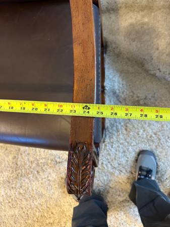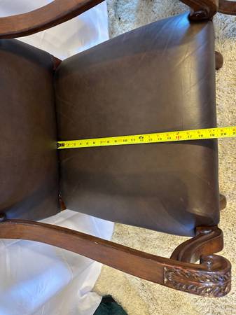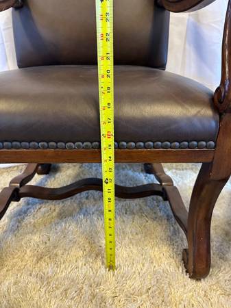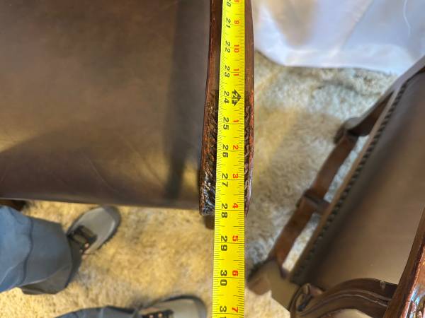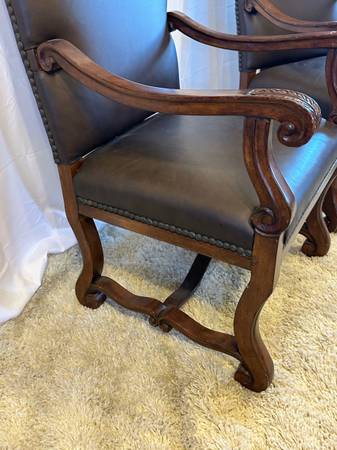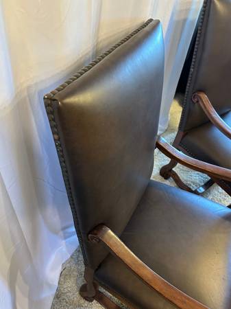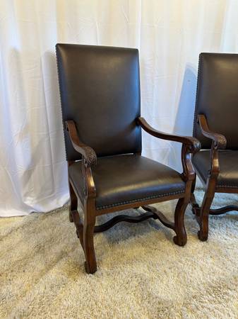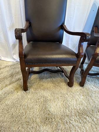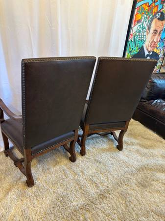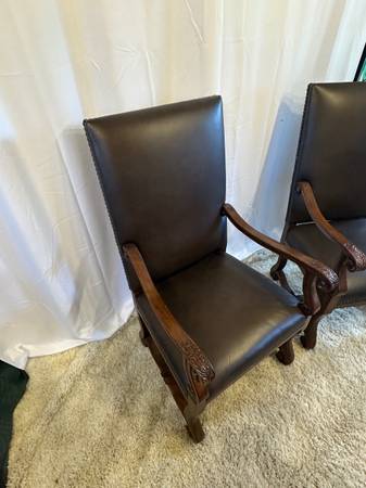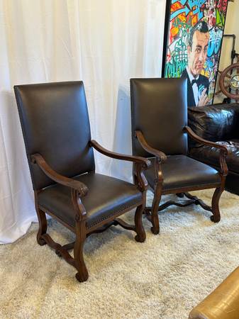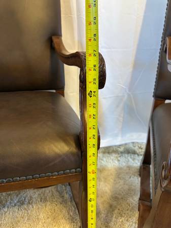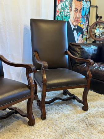 Genuine Leather High Back Armchairs Nailhead Carved Baroque Spanish Wood Chairs Pair of 2 Accent Genuine Black Leather High back 26” Tall Very comfortable Carved claw design on arms , nailhead rivet...