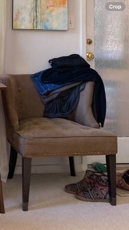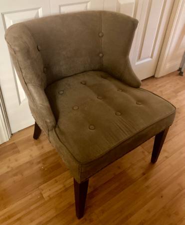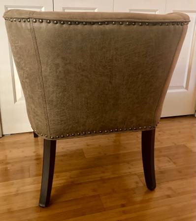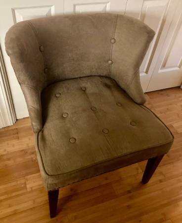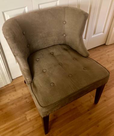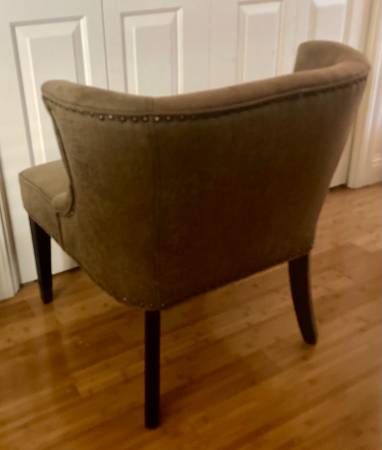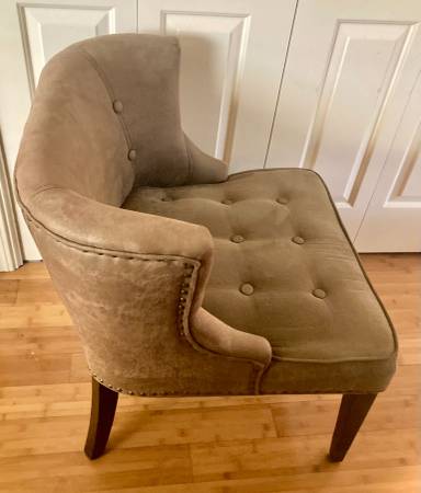Bennett Chair for sale - compact, comfortable, and nice for a reading nook, bedroom, or living room. Approximate dimensions: 25″ W × 32″ H × 25″ D. Bronze brown suede like material with metal nailhead accents and solid wood legs. Great condition, barely used with no stains, rips or fading.