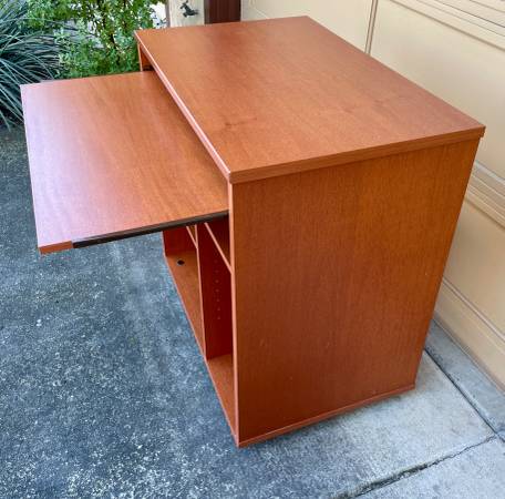 Scandi-style rolling desk or side table in good, clean condition. Left shelf is adjustable. Center shelf pulls out. Four wheels, two locking. Melamine laminated wood finish, easy cleaning....