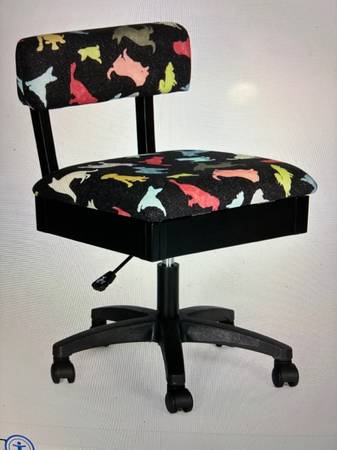 Arrow hydraulic sewing chair with dog print fabric (see photo). Has targeted lumbar support, storage compartment in seat, five star swivel base.