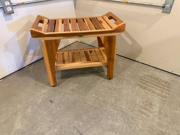 Beautiful teak bathroom Bench. Like new used for staging a house sale then stored.