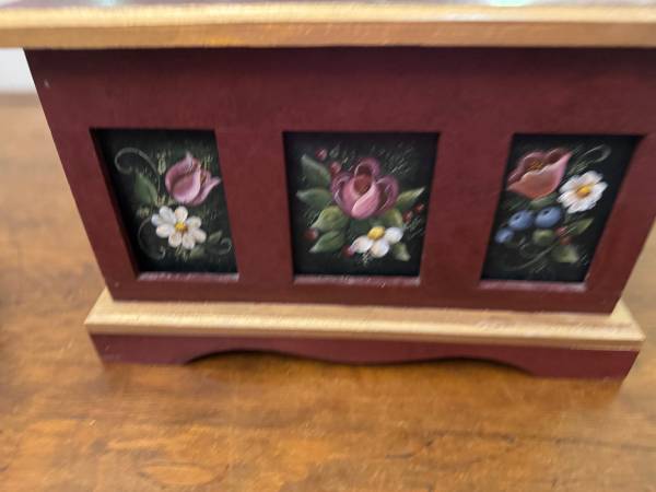 The front has three square panels with hand-painted flowers and berries.
