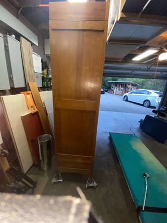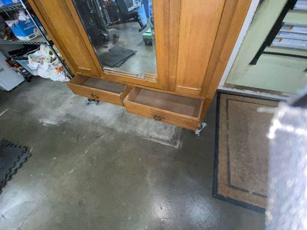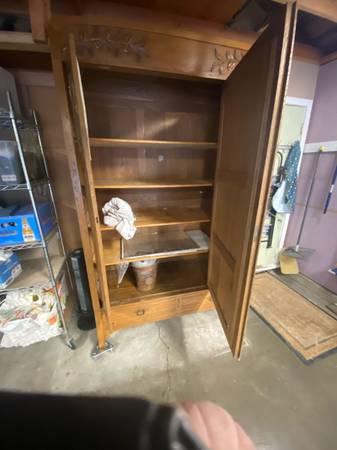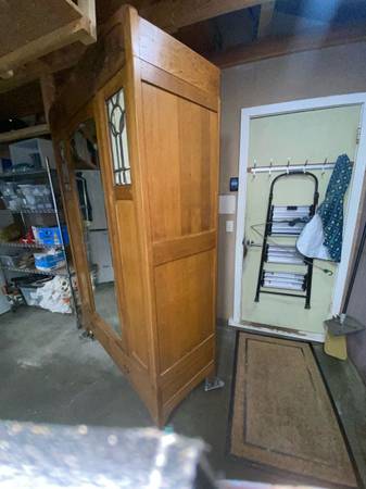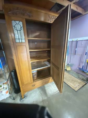 Lovely antique solid oak armoire with carvings. Has clean lines that