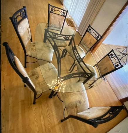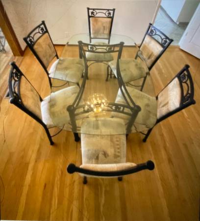 Vintage glass and wrought iron dining room table and chairs. Very heavy well made and sturdy. Fabric could use a replacing, but all else is in excellent condition. Please feel free to make an offer...