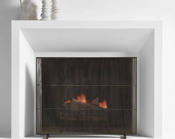Mid-century modern styling screens the hearth in handcrafted iron with a warm, antiqued brass finish. Freestanding, footed screen is rich with texture in both the wire construction and the patina.