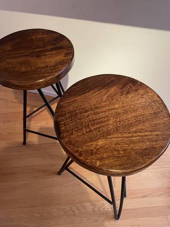 Beautiful set of two bar stools. Each stool is topped with a round dark solid wood seat. Durable black hairpin steel legs. Rustic charm. Great condition, we loved these. 30 inches tall