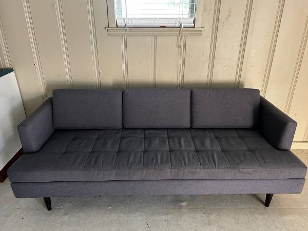 Custom-made soda in midcentury modern style. Shows wear consistent with age and a bit of staining on the cushions.