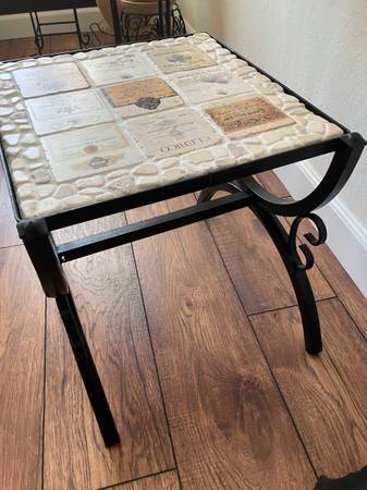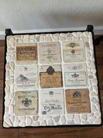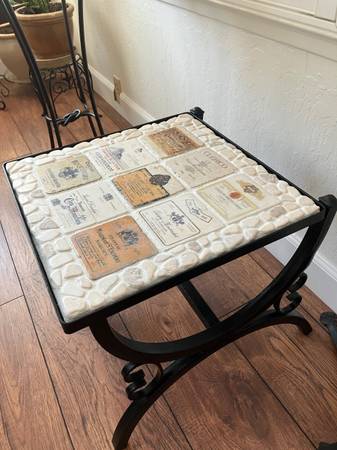 Unique wrought iron table topped with French and Italian winery label tiles and flat stones for a charming and rustic look. The table measures approximately 17 x 16 x 16 1/2“ tall and is in...