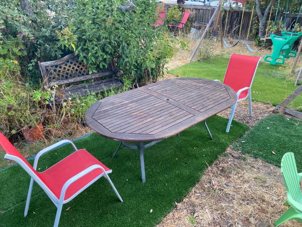 Selling a Crate & Barrel Outdoor Patio Teak Table & Chairs Set that’s excellent condition. The table has a metal frame with umbrella hole in the middle. Dimensions: H:30" W:44" L:73" Can...
