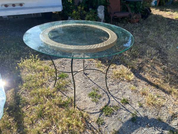 Selling a glass side table with tempered glass inserts that’s in excellent condition. Its very sturdy, glass insert is removable and have no scratches or chips. Top frame is wicker and metal legs....