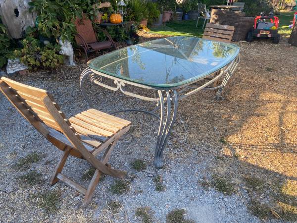 Table frame is made of coated rod iron and is very durable and sturdy. The top is thick tempered glass.